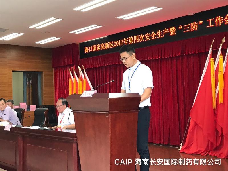 2017年10月20日,在海口國家高新區(qū)2017年第四次安全生產(chǎn)暨“三防”工作會(huì)議上,海南長安國際制藥有限公司等11家企業(yè)在第20號(hào)臺(tái)風(fēng)“卡努”期間,積極配合高新區(qū)管委會(huì)做好防風(fēng)防汛及臨時(shí)避險(xiǎn)點(diǎn)的安置工作,獲得“優(yōu)秀企業(yè)”表彰,公司有幸代表受表彰的企業(yè)之一受邀上臺(tái)發(fā)言。